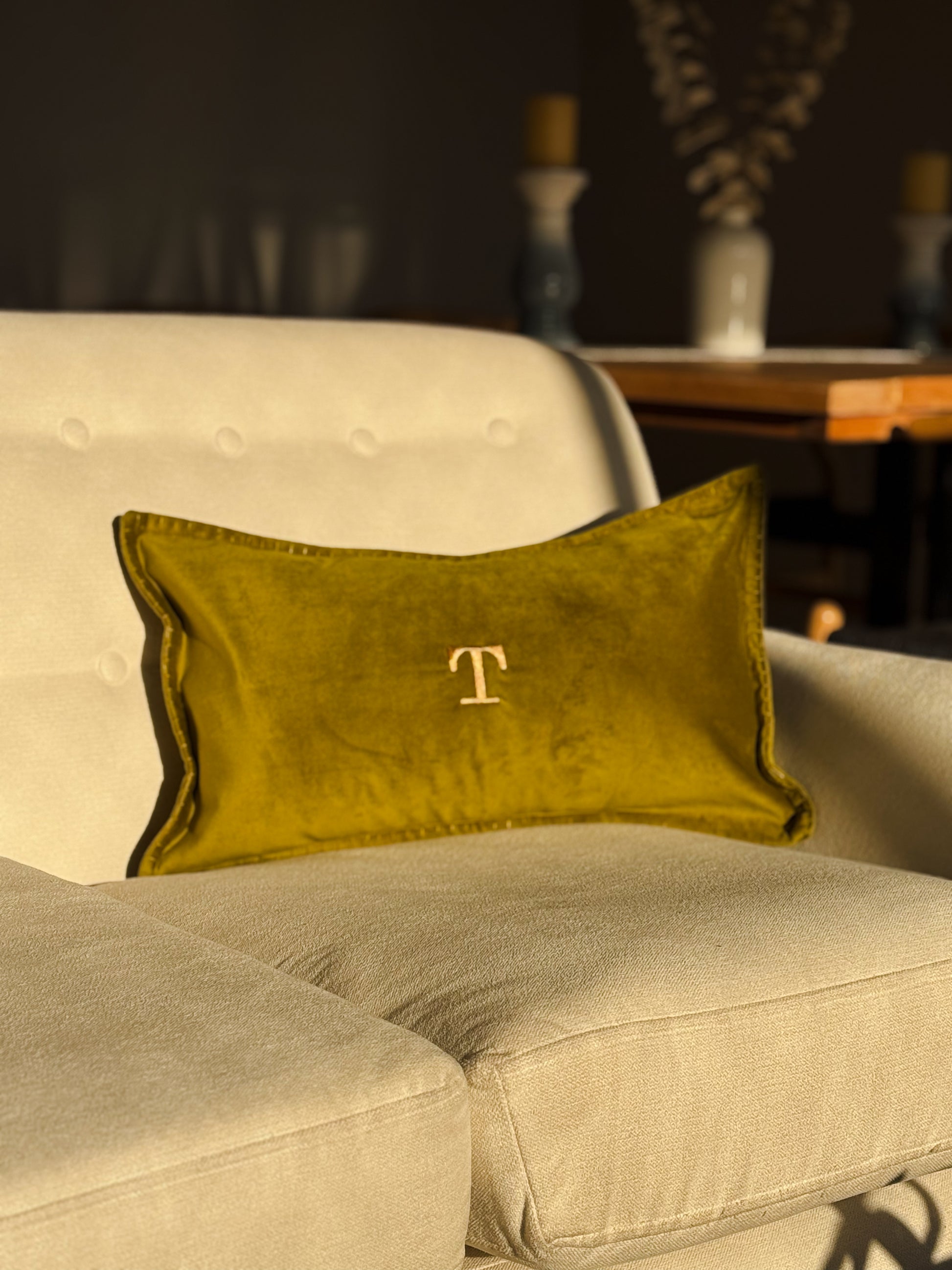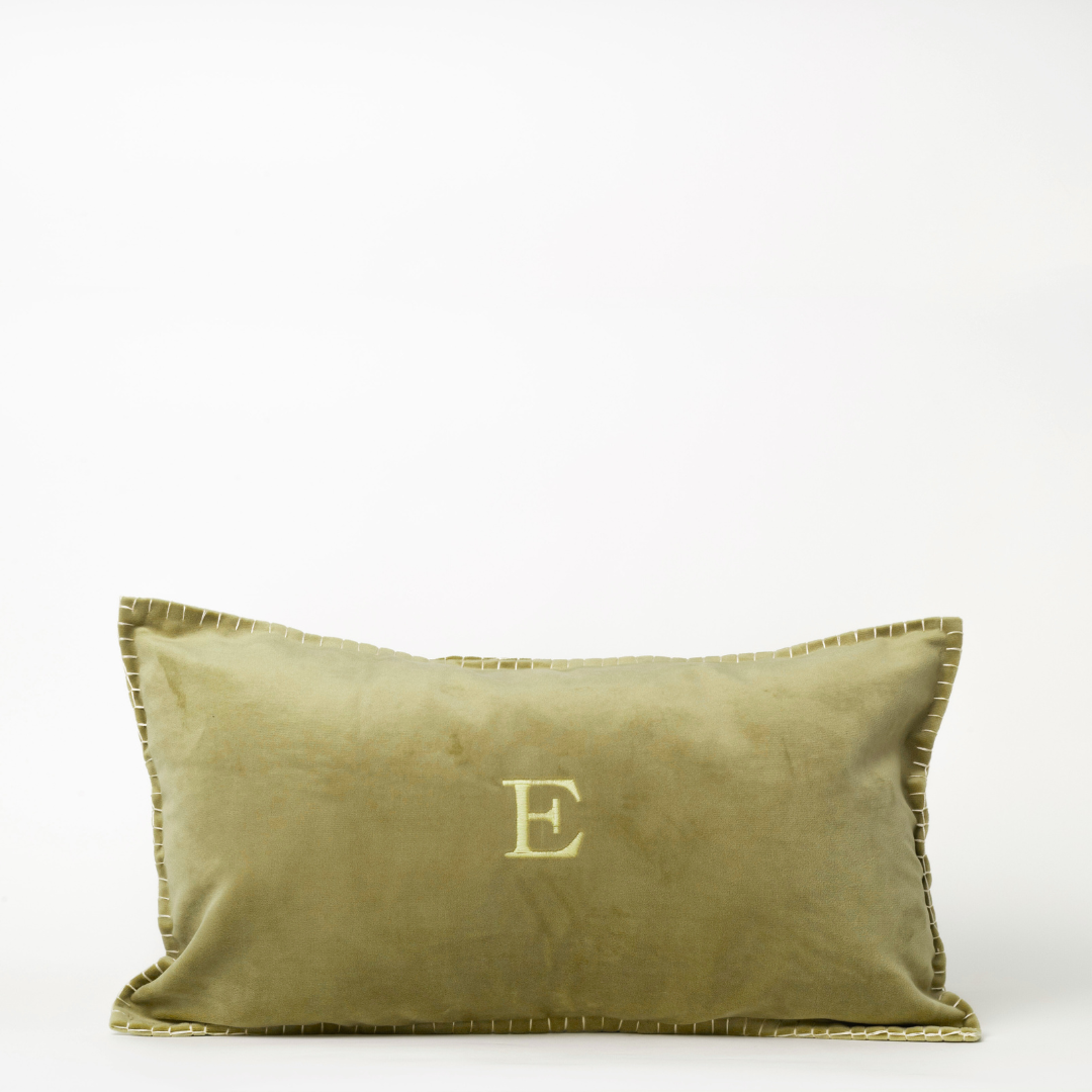 Cojín de felpa 30 x 50 bordado con una inicial. Con un borde bordado a mano del mismo color que la inicial.