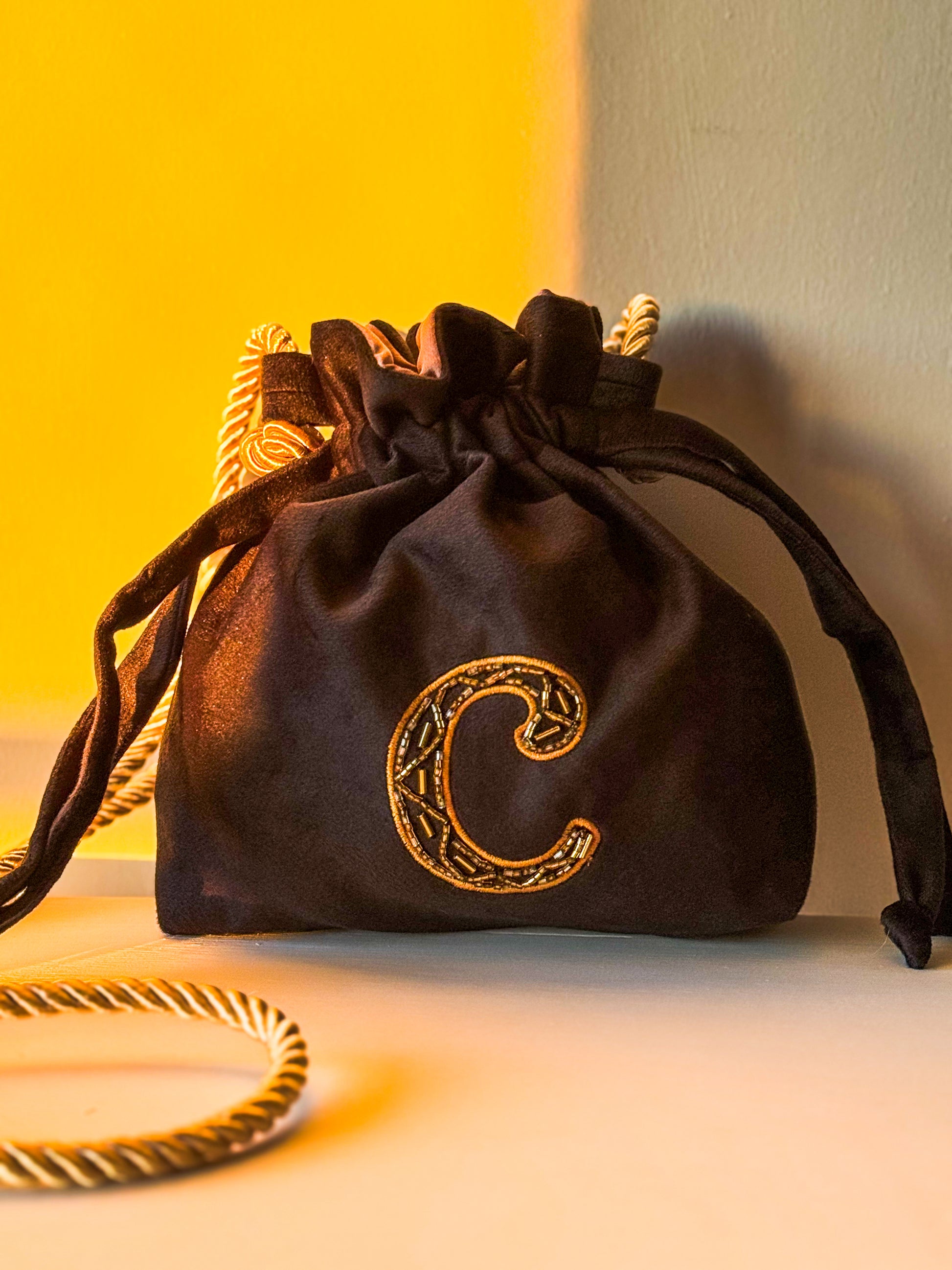 Camila, Catalina, Carolina, etc... Este saquito es para ti. Saquito bandolera de felpa 22 x 21 cm con inicial bordada con mostacillas a mano. Con la INICIAL C. En dorado