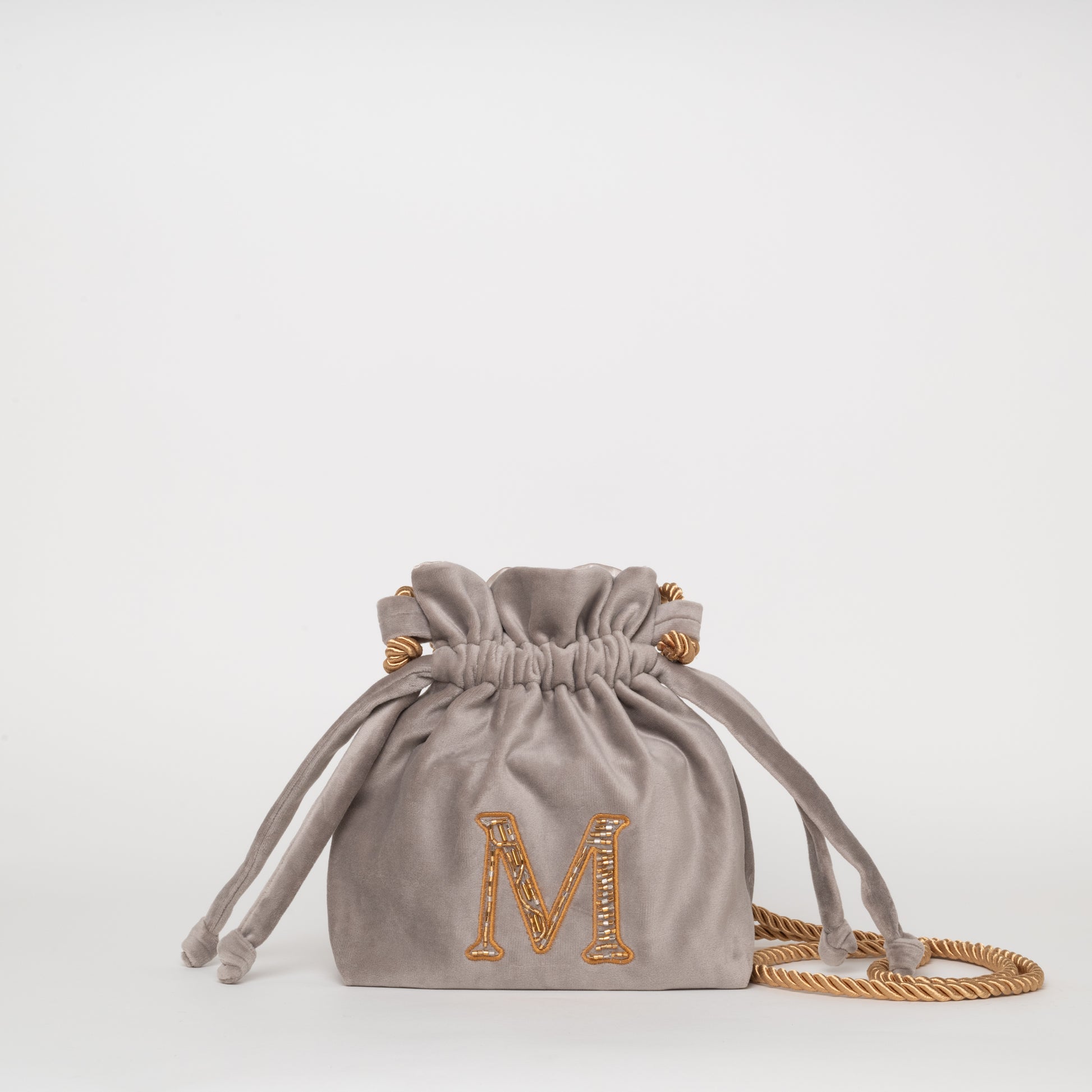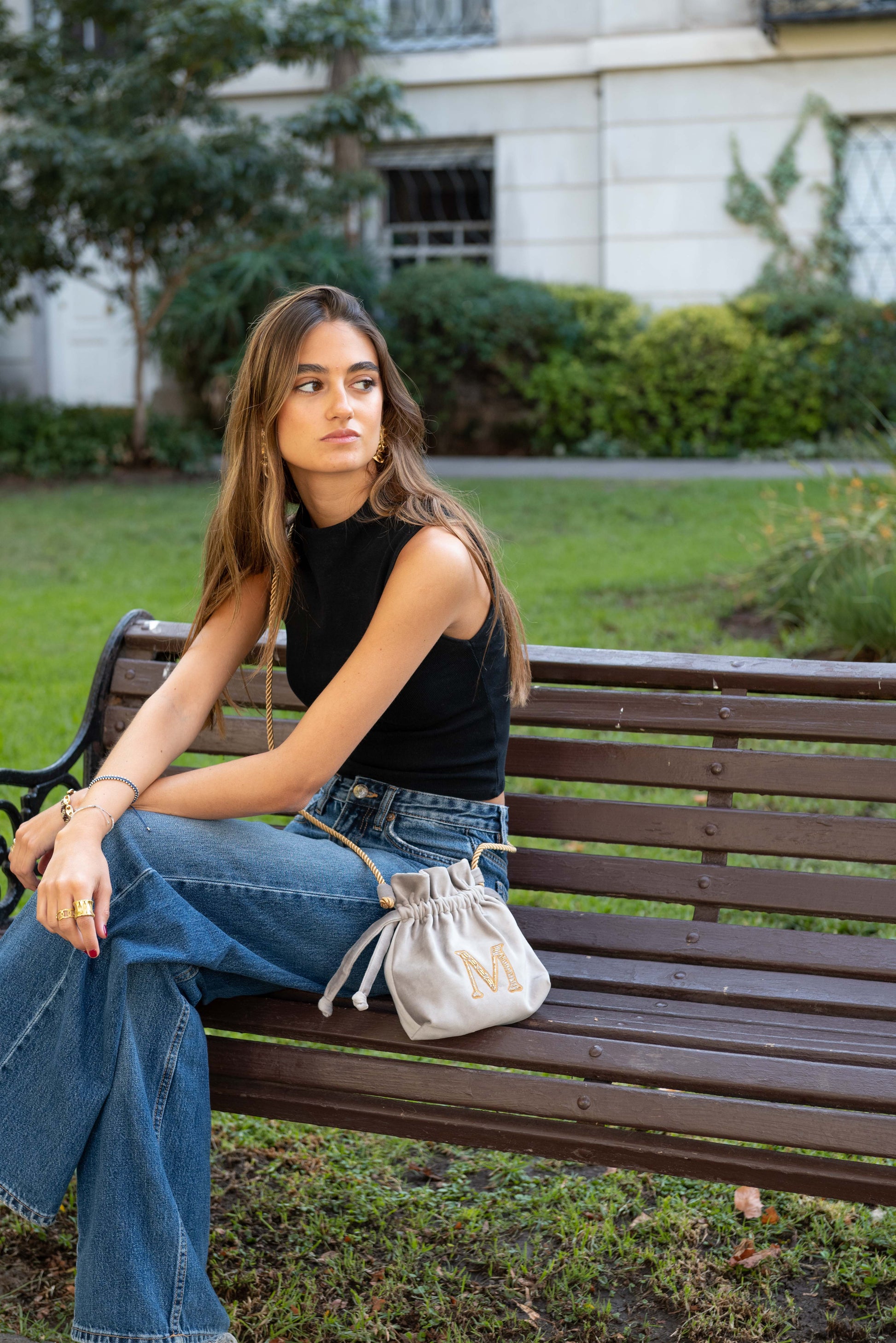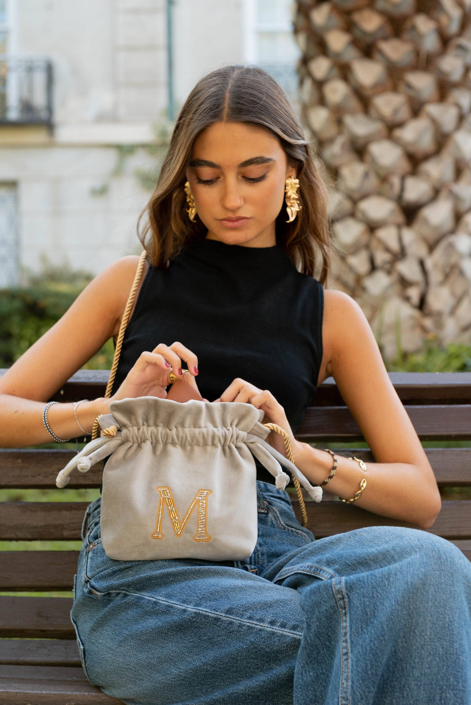 Saquito bandolera de felpa 22 x 21 cm con inicial bordada con mostacillas a mano.