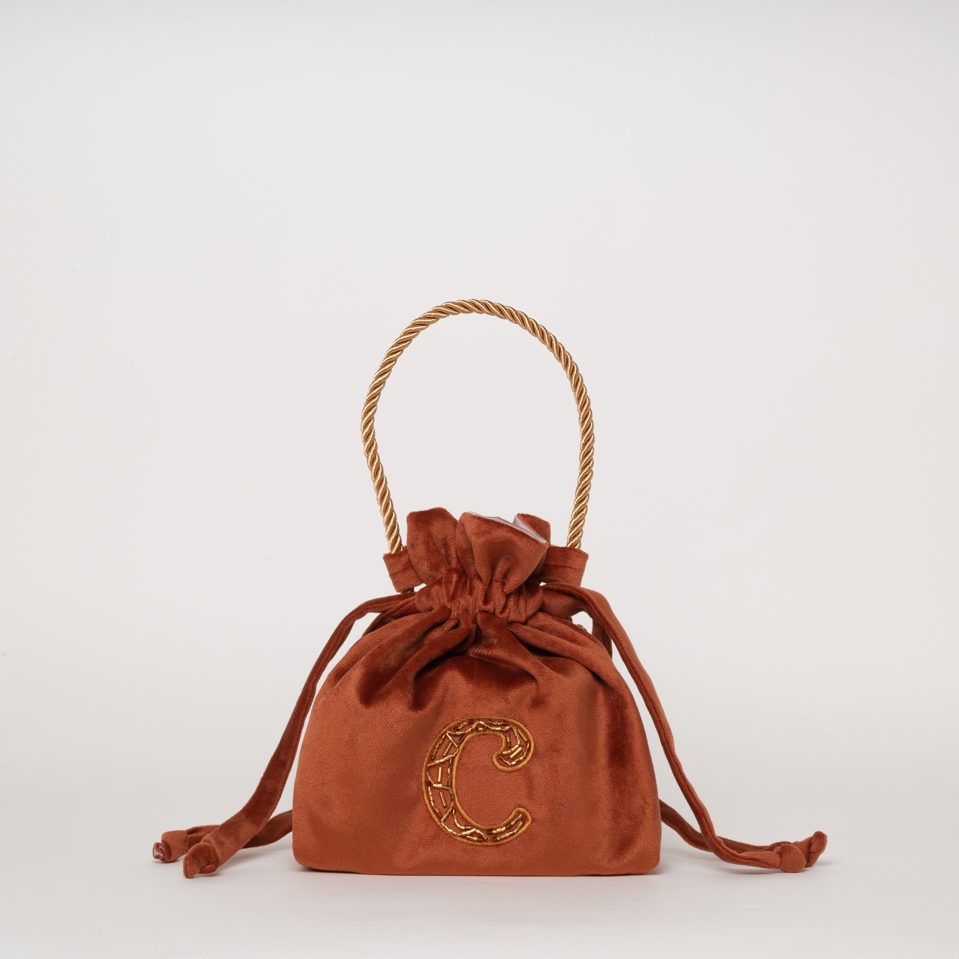 Saquito bandolera de felpa 22 x 21 cm con inicial bordada con mostacillas a mano.
