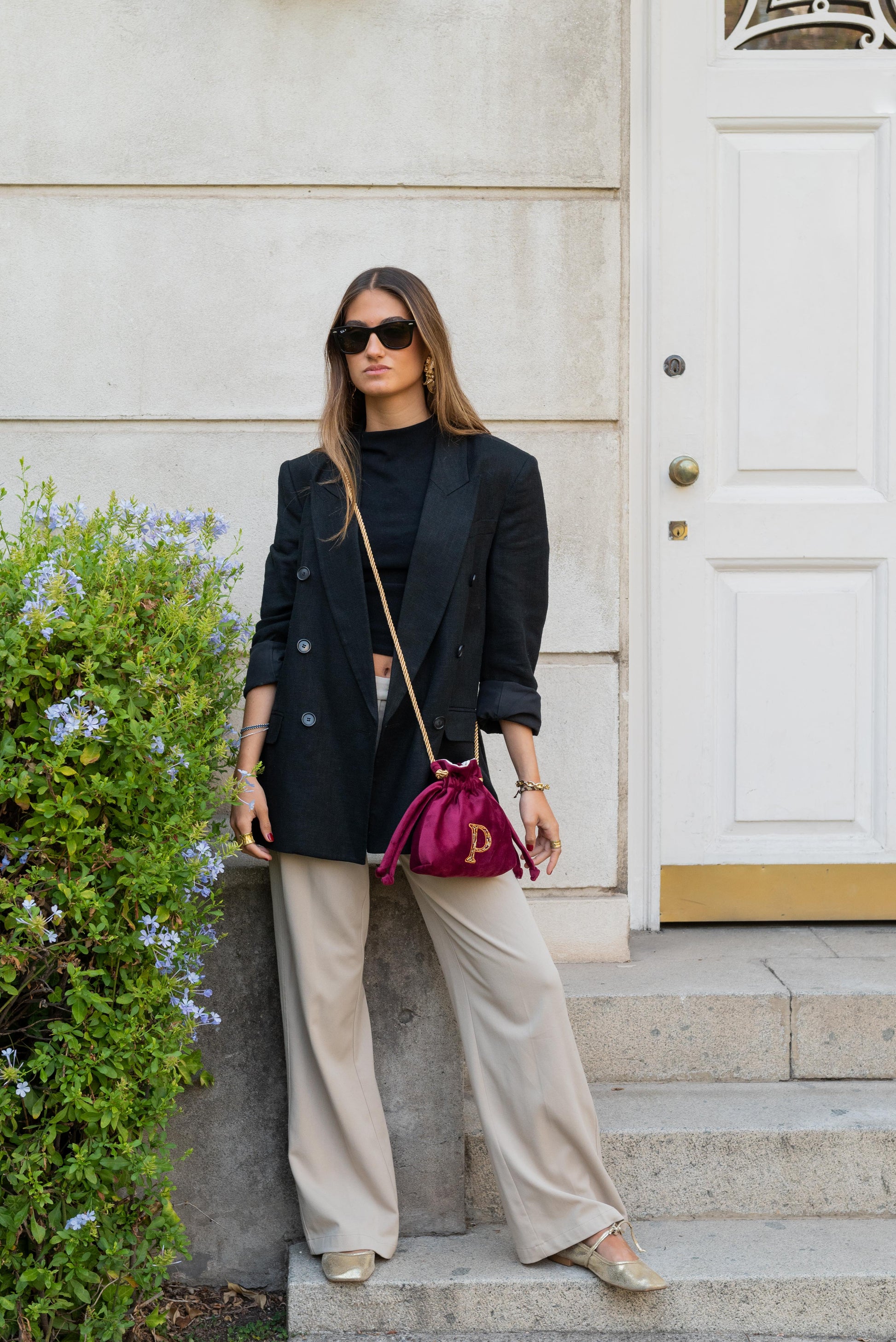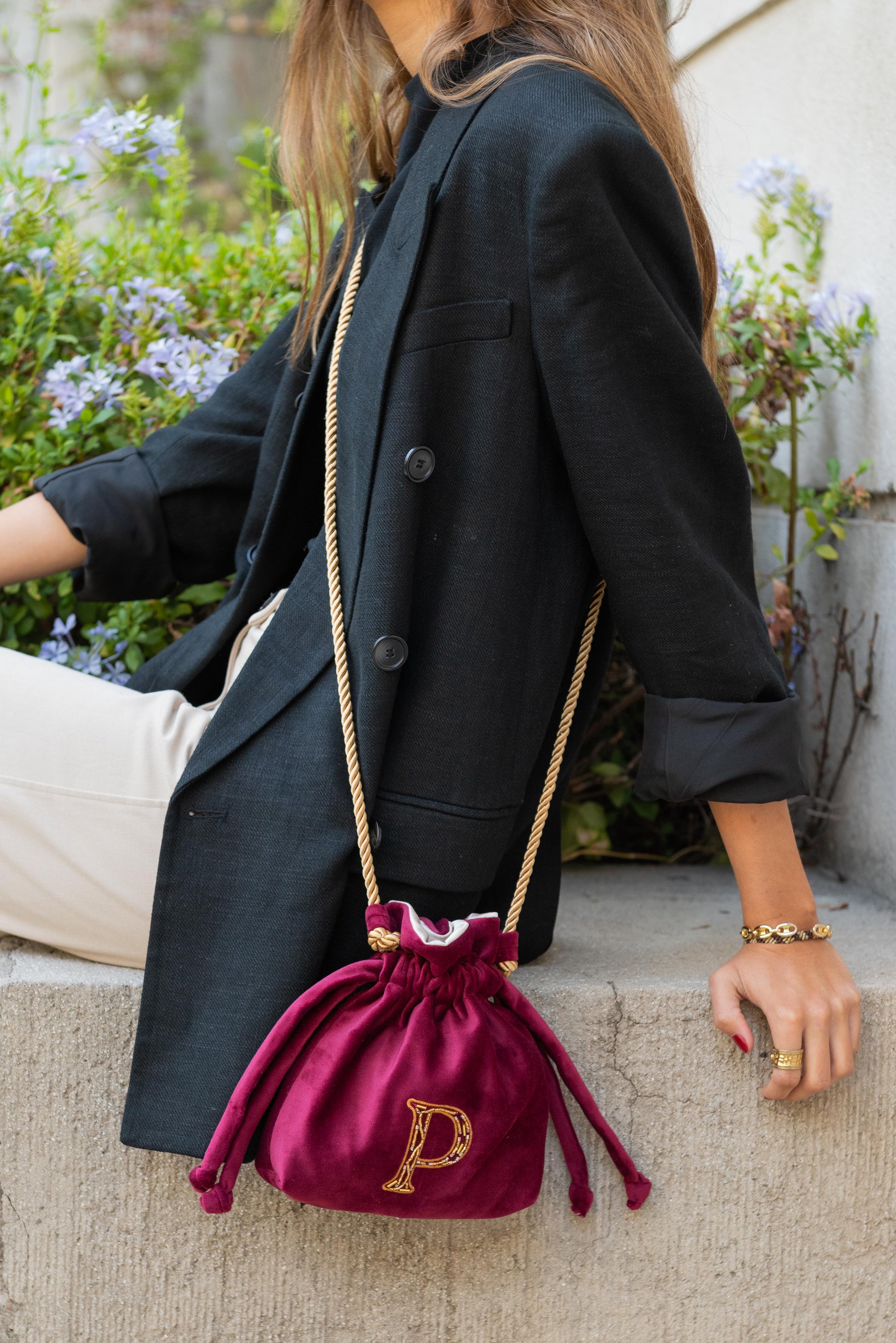Saquito bandolera de felpa 22 x 21 con inicial bordada con mostacillas a mano.