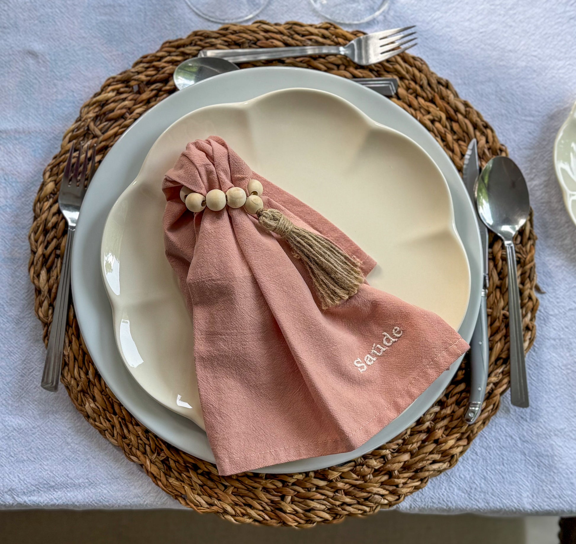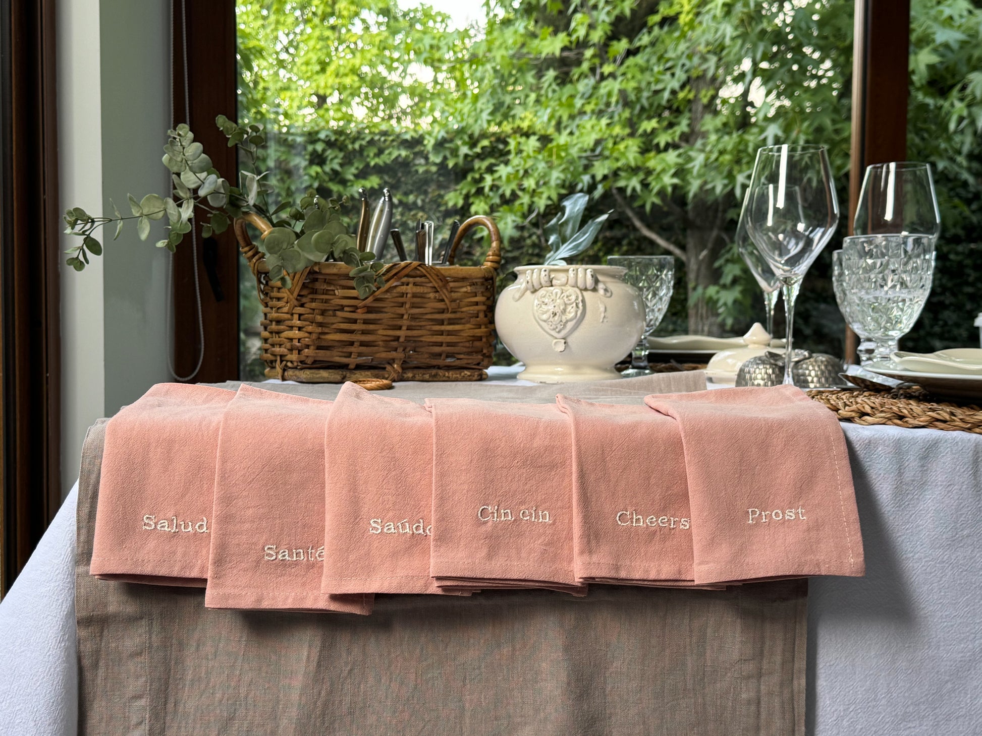 Edición limitada: Dale un toque especial a tu mesa esta temporada con este pack de 6 servilletas de lino con algodón, suaves y naturales. Cada una bordada con la frase “Salud” en distintos idiomas. Un detalle elegante, cálido y perfecto para tu mesa de verano.